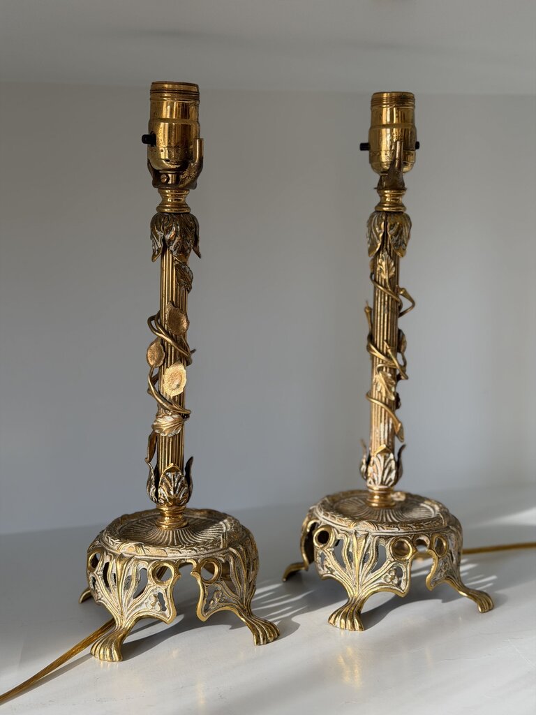 0014 Gilt Metal Floral Lamp Pair w/ shades (as-is) both work
