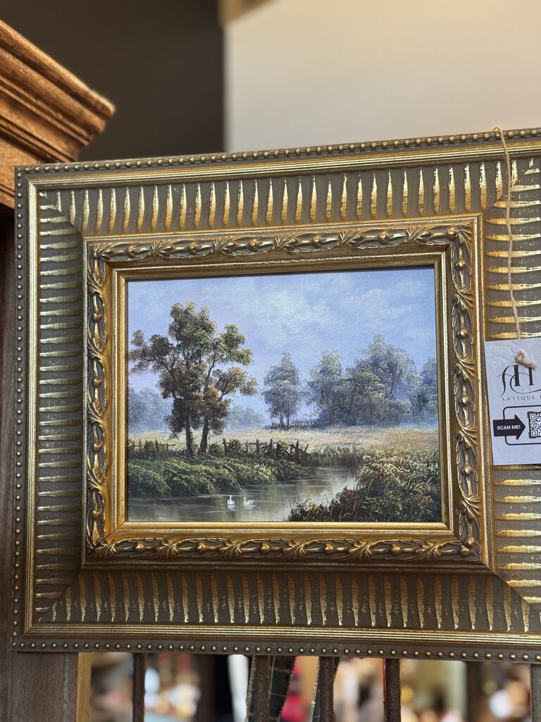 0123 Vintage swan landscape oil on board painting