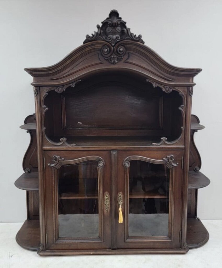 Age appropriate wear-some veneer lifting. best guess is walnut wood. has locking key. Glass doors have been removed for transport [local pickup only]
