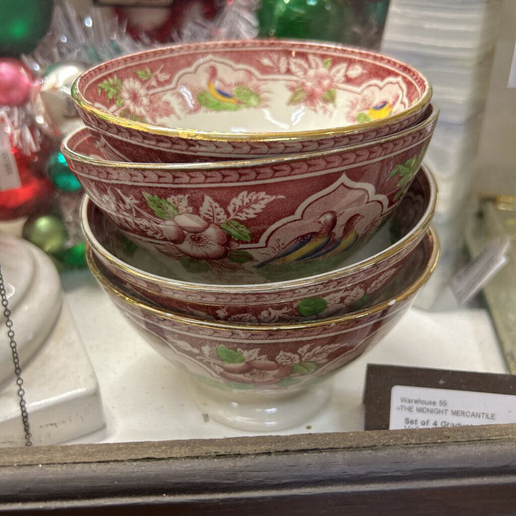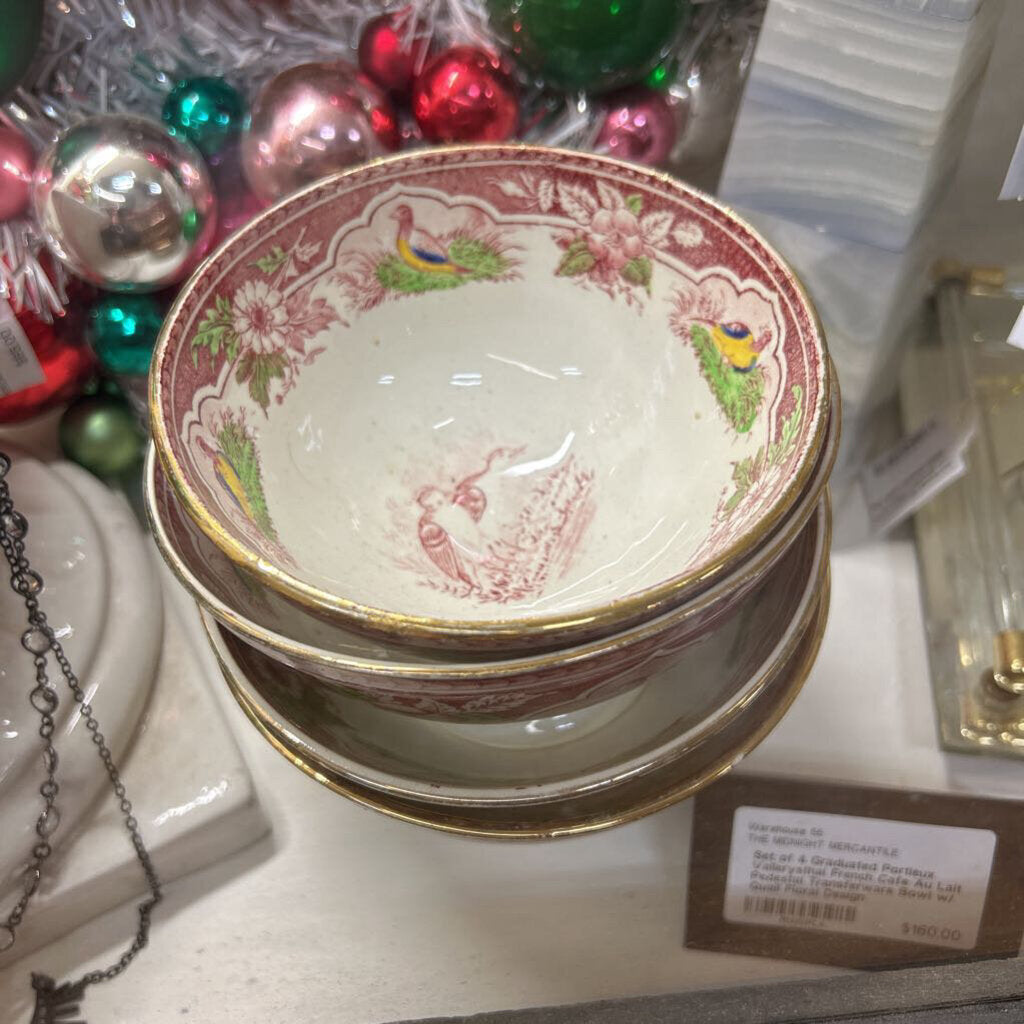 Set of 4 Graduated Portieux Vallerysthal French Cafe Au Lait Pedestal Transferware Bowl w/ Quail Floral Design