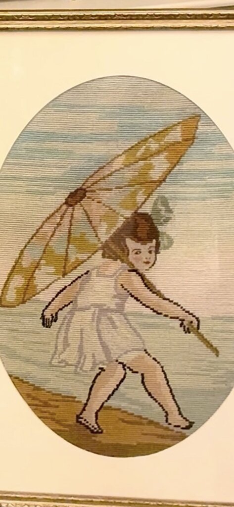 Vintage Framed Needlepoint Girl on the Beach Artwork 17" x 24"
