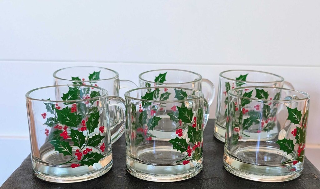 Vintage Indiana Glass Holly Coffee Mugs - set/6